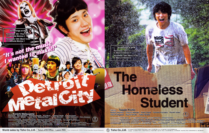 DETROIT METAL CITY (Detoroito Metaru Shitei) Comedy Domestic Distribution: Toho Co., Ltd., August 23, 2008 International Sales: Toho Co., Ltd. Japanese with English Subtitles, 104 minutes Official Movie Site: go-to-dmc AFM Screening: Thursday, November 6, 1:00pm at AMC Santa Monica 1, Monday, November 10, 1:00pm at AMC Santa Monica 1 The story is about a pure-hearted 23-year-old boy (Kenichi Matsuyama of DEATH NOTE and L), who cherishes French pop/bossa nova music, happens to be a member of a Death Metal band "Detroit Metal City" (DMC) and turns out to be its charismatic vocalist under the fictitious name of "Johannes Klauser II". Intending to become a pop celebrity, he makes a triumphant debut as the Death Metal vocalist, and the story hilariously describes his array of woes until he finally faces off on stage against the legendary and world-renowned Death Metal vocalist "Jack IL Dark" (played by Gene Simmons of KISS). Director: Toshio Lee; Writer: Mika Omori; Producers: Yuka Higuchi, Genki Kawamura; Cast: Kenichi Matsuyama, Gene Simmons THE HOMELESS STUDENT (Homeless Chugakusei) Comedy, Drama Domestic Distribution: Toho Co., Ltd., October 25, 2008 International Sales: Toho Co., Ltd. Japanese with English Subtitles, 116 minutes Official Movie Site: homeless AFM Screening: Thursday, November 7, 3:00pm at Mann Criterion 4, Monday, November 10, 3:00pm at Mann Criterion 6 Based on the instant best-seller autobiography (over one million copies sold only two months after publication) by Hiroshi Tamura from the comedy duo Kirin, the film depicts a boy`s adolescent life, filled with love and warmth, tears and laughter, suddenly prompted by an unpredictable incident. Hiroshi, an 8th grader, comes home to find his family has been evicted. His father announces "Everybody dismissed!" and the family members go their separate ways. Separated from his brother and sister, homeless Hiroshi struggles to live at a nearby park, unexpectedly discovering all the love that surrounds him. Director: Tomoyuki Furumaya; Writers: Tomoyuki Furumaya, Noriko Goto; Producers: Sigeji Maeda, Yoshihiko Taneda, Hisashi Usui, Toshiie Tomita; Cast: Teppei Koike, Yuko Tanaka
