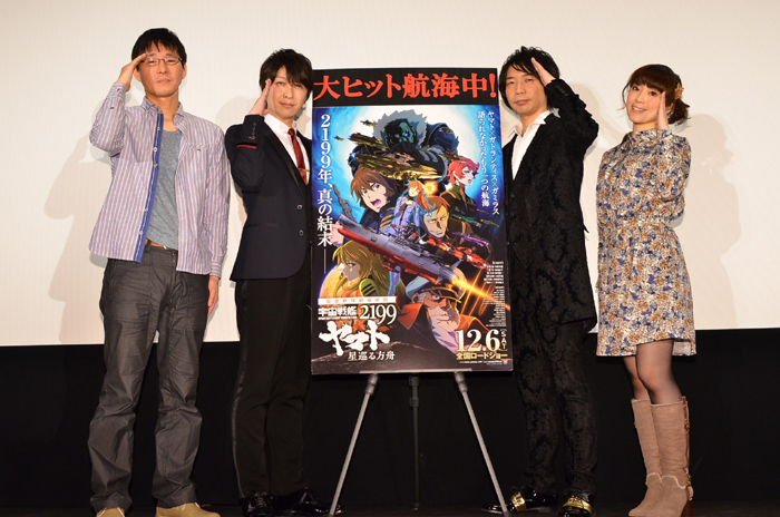 Producer Mikio Gunji and voice actors Daisuke Ono (Susumu Kodai), Junichi Suwabe (Fomto Berger) and Eriko Nakamura at the Thank-You Stage Greeting. Photo courtesy of Shochiku. © 2014 Space Battleship Yamato 2199 Production Committee