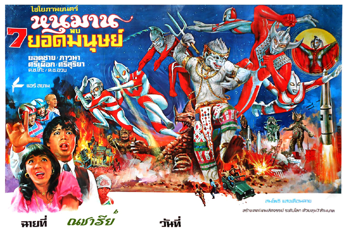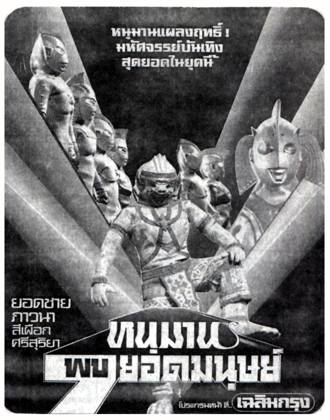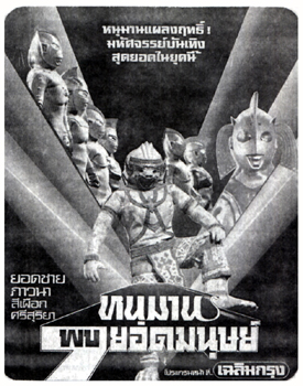 SIX ULTRA BROTHERS VS THE MONSTER ARMY (aka HANUMAN AND 7 ULTRAMAN) Thai Version: HANUMAN AND 7 ULTRAMAN (aka HANUMAN VS 7 ULTRAMAN and HARUMAN AND THE SEVEN ULTRAMAN) Thai Title: ?????? ?? 7 ????????? (Hanuman Pob Jed Yod Manud) Literal Translation: Hanuman and Seven Ultramen Release Date: November 30, 1974 Running Time: 80 minutes Distributor: Chaiyo Productions Co., Ltd. Japanese Version: SIX ULTRA BROTHERS VS THE MONSTER ARMY Japanese Title: ????6??VS???? (Urutora Roku Kyoudai tai Kaiju Gundam) Literal Translation: 6 Ultra Brothers vs the Monster Army Release Date: March 17, 1979 Running Time: 82 minutes Aspect Ratio: 2.35:1 Distributor: Shochiku Fuji Co., Ltd. Thai Reissue: HANUMAN VS 11 ULTRAMAN Thai Title: ?????? ?? 11 ????????? (Hanuman Pob Sib Et Yod Manud) Literal Translation: Hanuman and Eleven Ultramen Release Date: April 28, 1984 Running Time: 103 minutes Distributor: Chaiyo Productions Co., Ltd. Production: Tsuburaya Productions Co., Ltd., Fuji Eiga, Chaiyo Productions Co., Ltd. Producer: Noboru Tsuburaya, Sompote Saengduenchai Directors: Sompote Saengduenchai, Shohei Tojo FX Director: Kazuo Sagawa Writer: Bunkou Wakatsuki Music: Tohru Fuyuki Thai Theme Song "Hanuman and 7 Ultramen": Chai Muangsing and Sompoch Lampong Japanese Theme Song "Our Ultraman": Isao Sasaki and Columbia Cradle Club Cast Koh: Sanit Kaewdee Anun: Ouab Somchart Professor Visut: Yodchai Meksuwan Marisa: Pawwana Chanajit ZAT Agent Sipueak: Sipueak ZAT Agent Sisuriya: Sisuriya Bandits: Kan Booncho, Chan Wanpen, Somnouk Japanese Voice Cast Koh-chan: Ai Sasaki Ananda (Anun): Sumiko Shirakawa Professor Viruddo (Professor Visut): Takashi Nakagi Marisa: Yoko Kuri Shipuaku (Sipueak): Junpei Takiguchi Sisuriya: Shingo Kanemoto Bandits: Tetsuo Mizutori, Shigeo Hashimoto Ultraman: Toshio Furukawa Hanuman: Issei Futamata Mother of Ultra: Taeko Uesaka Narrator: Shojiro Kihara Story: The union of the wind god Vayu and the celestial lady Sawaha (known in Hindi as Anjana) leads to the birth of Hanuman, the mischievous monkey deity. The sun drifts closer to the Earth, causing soaring temperatures and severe drought in Thailand. The heat is so intense that Sipueak and Sisuriya, two male agents from the Thai branch of ZAT, strip down to their (what appear to be women`s onepiece) swimsuits and jump in a lake. Unfortunately the lake contains drinking water and no swimming is allowed. Trying to bring an end to the heat wave, a group of young children gather in the ruins of an old temple to perform a traditional Khon dance and pray for rain. A boy named Koh leads the ceremony with a ritualistic dance performed while wearing a mask bearing the likeness of Hanuman. Koh spots a trio of robbers stealing the head off a statue of Buddha. The boy tries to prevent the theft but is shot repeatedly in the face and killed. From the Land of Light in Nebula M78, the Mother of Ultra witnesses the tragedy. Reaching down from the heavens, she recovers Koh`s body and -- with the help of the six Ultra Brothers Ultraman, Zoffy, Ultra Seven, Ultraman Jack, Ultraman Ace, and Ultraman Taro -- merges the boy`s soul with the spirit of Hanuman. Koh is returned to life and sent back to Earth, where he discovers that his friend, a boy named Anun, has passed out from the intense heat. Transforming into Hanuman, Koh recovers the magical Sanyurarintorichawa Gochang flowers which he uses to revive Anun. Koh next hunts down the thieves who murdered him. As Hanuman, he metes out some brutal justice by stomping and crushing all three robbers to death... hopping, scratching, and dancing all the while. After reattaching the Buddha statue`s head, Hanuman flies off to find his former master Rama, the seventh incarnation of the god Vishnu, riding his fiery chariot through space. Hanuman convinces Rama to pull the sun back away from Earth and return it to its proper place in the solar system. Meanwhile, back in Thailand, scientist Professor Visut is in charge of an operation which will use rockets to seed clouds and create rain. Assisting him is his girlfriend (and Anun`s older sister) Marisa, the ZAT team members Sipueak and Sisuriya, and a ground crew wearing the uniforms of SAF (Science Attack Force) from Tsuburaya Productions` television series MAGMA MAN (Faiayuman, 1973). The first rocket launch is a success and creates a strong, if unfortunately brief, downpour. But Professor Visut`s second attempt is a disaster; the rocket explodes on the launch pad and destroys several nearby rockets in a series of fiery detonations. The explosions also awaken several giant monsters -- Gomora from ULTRAMAN, Dustpan from MIRROR MAN, and Astromons, Tyrant and Dorobon from ULTRAMAN TARO -- who emerge from underground and proceed to destroy what`s left of the rocket base. The Thai air force proves useless in stopping the beasts` rampage, and the local people flee for their lives. Marisa searches for her brother Anun and finds him in a tree. The boy leads her into the forest and calls out repeatedly for Koh, who finally arrives and transforms into Hanuman. Hanuman challenges the five monsters. At first he gets the better of his foes, but after he is tripped by Dorobon the kaiju to gain the upper hand. After taking a fierce beating, Hanuman is trapped in a sphere of energy by Gomora. Just when all seems lost, the Ultra Brothers arrive to save the day. The over-matched monsters are quickly defeated... Tyrant is killed in an explosion, Astromons and Dustpan have their heads and limbs sliced off by energy rings tossed by Hanuman, and the monkey god and Ultraman literally strip the flesh from Dorobon`s bones. Only Gomora remains, and he is encircled by Ultramen and mercilessly beaten before Hanuman cuts him in two with a slash from his mystical sword. Hanuman celebrates their victory with another dance. He then hugs each Ultraman goodbye, and the alien heroes fly back to M78. Notes: The Japanese/Thai co-production SIX ULTRA BROTHERS VS THE MONSTER ARMY stands as one of the weirdest U