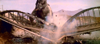 Wounded by a chemical assault, Yongary still finds the strength to destroy a bridge. © 1967 Keukdong Entertainment CompanyJO: It’s a little different situation. Toho Studios is pretty strong about keep the elements for a lot of their stuff so its is a little easier trying to restore those films than something like this. YONGGARY was a Japanese/Korean co-production. As vibrant as the Korean film industry is now, back in 1967 it wasn`t nearly as big. SFJ: It’s really started booming in the last few years. JO: Oh yeah, it’s amazing. And they’ve got some terrific films… I loved THE HOST. I thought that was really great. OLDBOY… they’ve got some great stuff coming out now. I have to say THE HOST is probably one of my favorite monsters from the last few years; it was fantastically designed. It was terrific. I was in Hong Kong last year and caught it in a theater there. I didn’t even think it would get released here because it’s got that anti-American thing going through it. It’s fun to have something that’s kind of scary, kind of funny, and kind of touching all at the same time. You see that in a lot of Chinese and Korean and some Japanese films; those kinds of tone shifts. I find it refreshing because it keeps you off guard. As for YONGARY, I’m not at MGM anymore but I’m seeing some of my “children” from those days come to light and it’s neat to see that. I like to peek in and see what the reviews are like. Literally, this Tuesday [September 11], three films I did a lot of work on came out. One is YONGARY, one is FROM BEYOND, and the other is WITCHFINDER GENERAL. It was good to see all three come out, and they’re getting pretty good reviews and feedback. It’s kind of nice to see that.