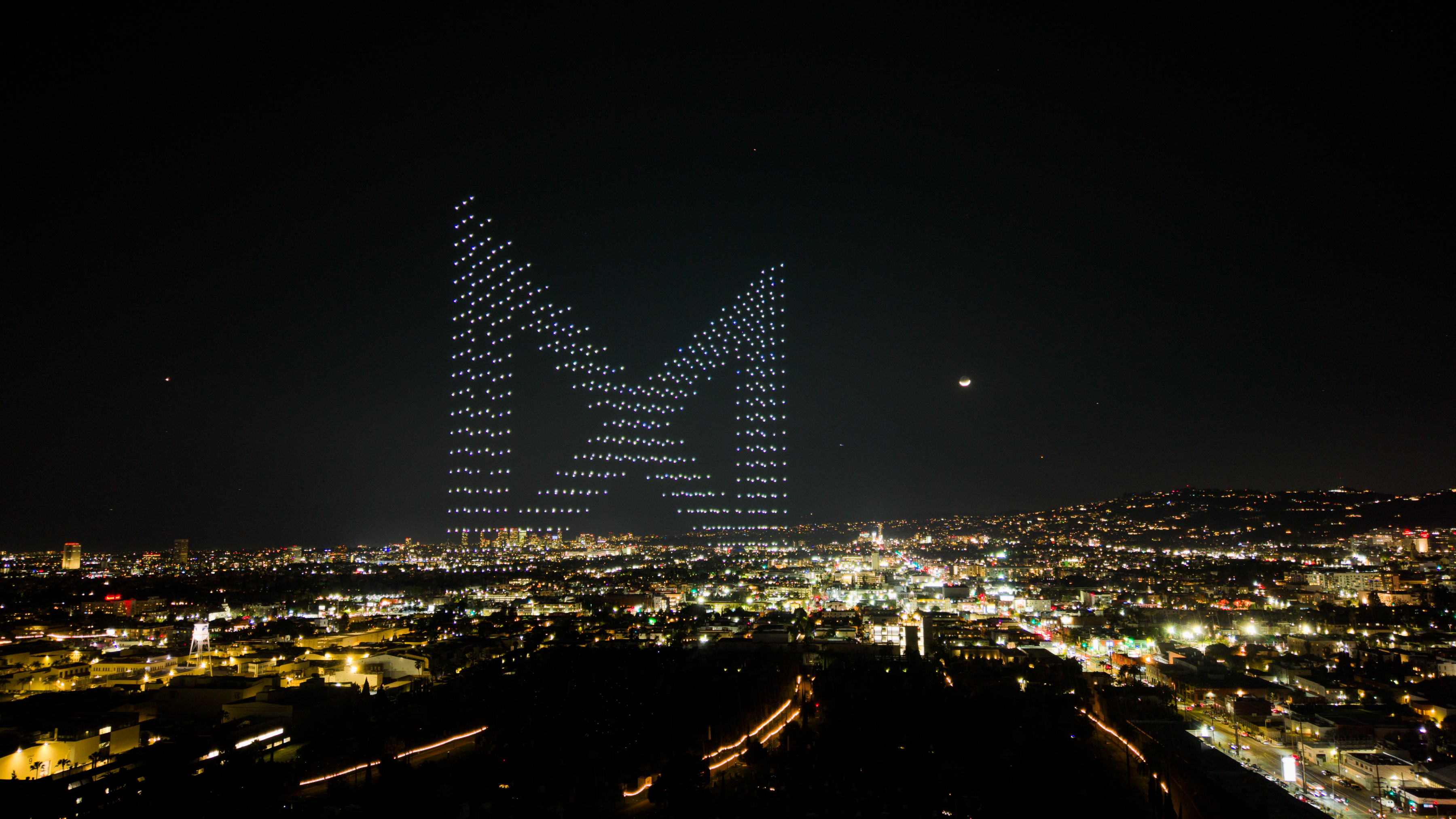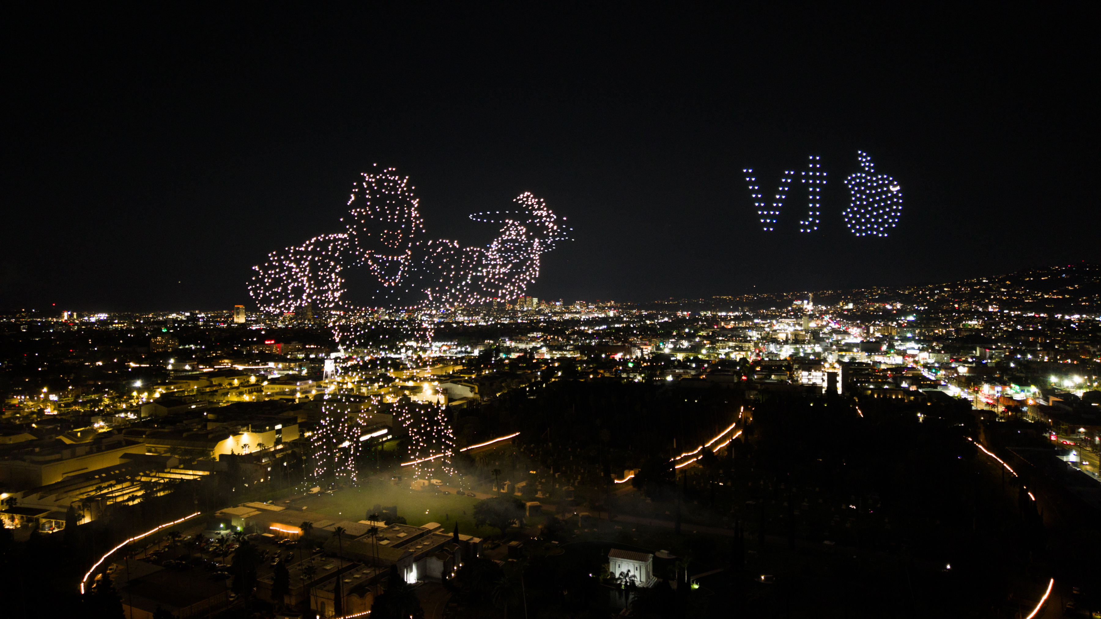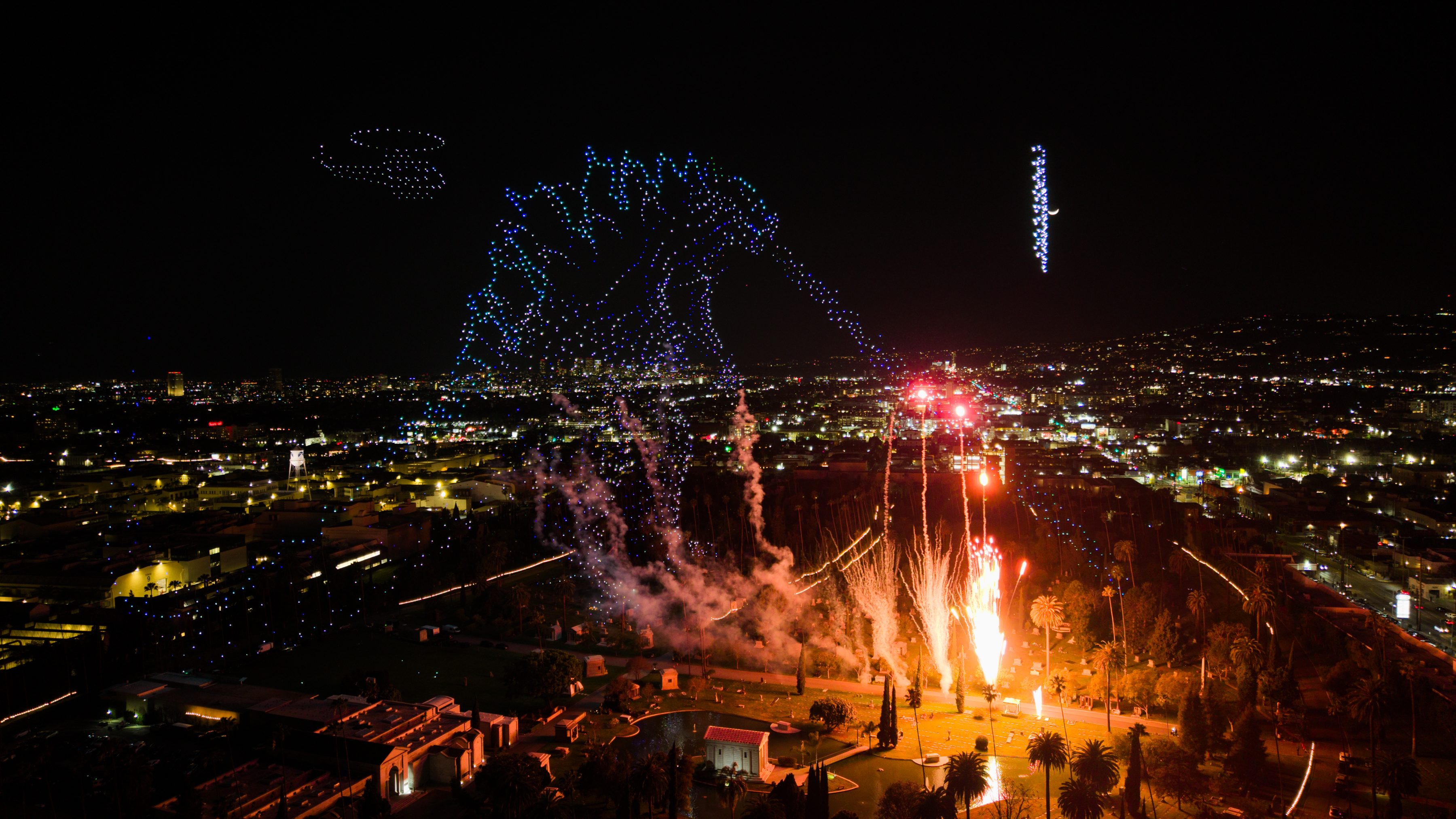 Set to a score developed by the show's composer, Leopold Ross, the 12-minute three dimensional drone show included 3,000 drones that flew nearly 500 feet in the sky (taller than the Statue of Liberty!) with a square footage of 1000’ x 1000’, or the size of three football fields, was stationed over the Hollywood Forever Cemetery, but due to it’s monstrous size it was viewable from three miles away at any direction.