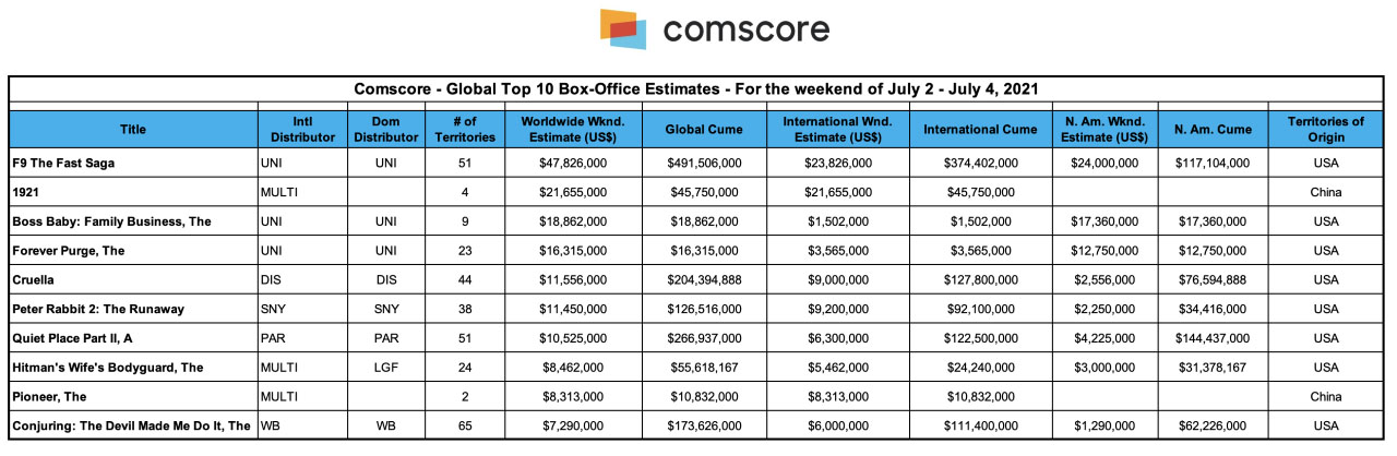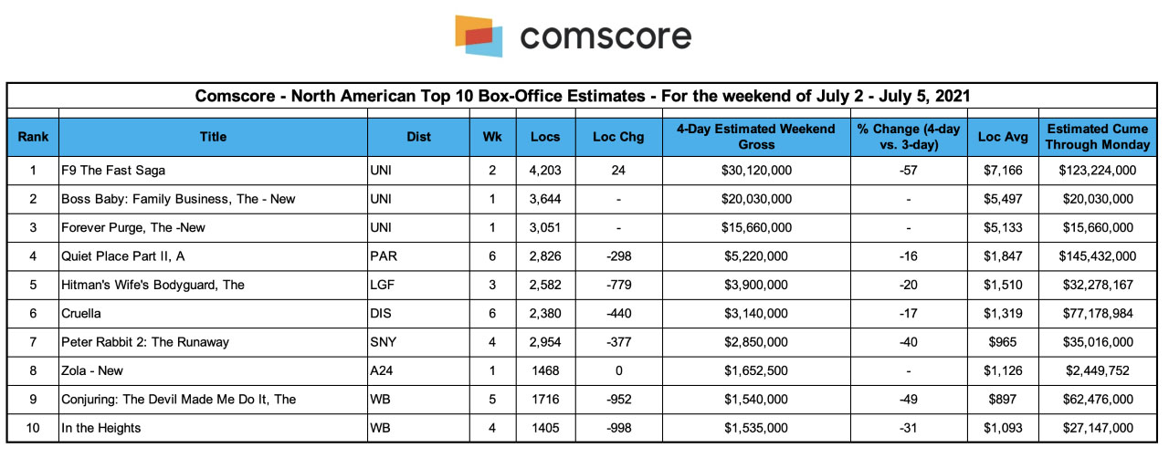 Comscore – Sunday Estimates - Weekend Box Office Roundup – July 5, 2021