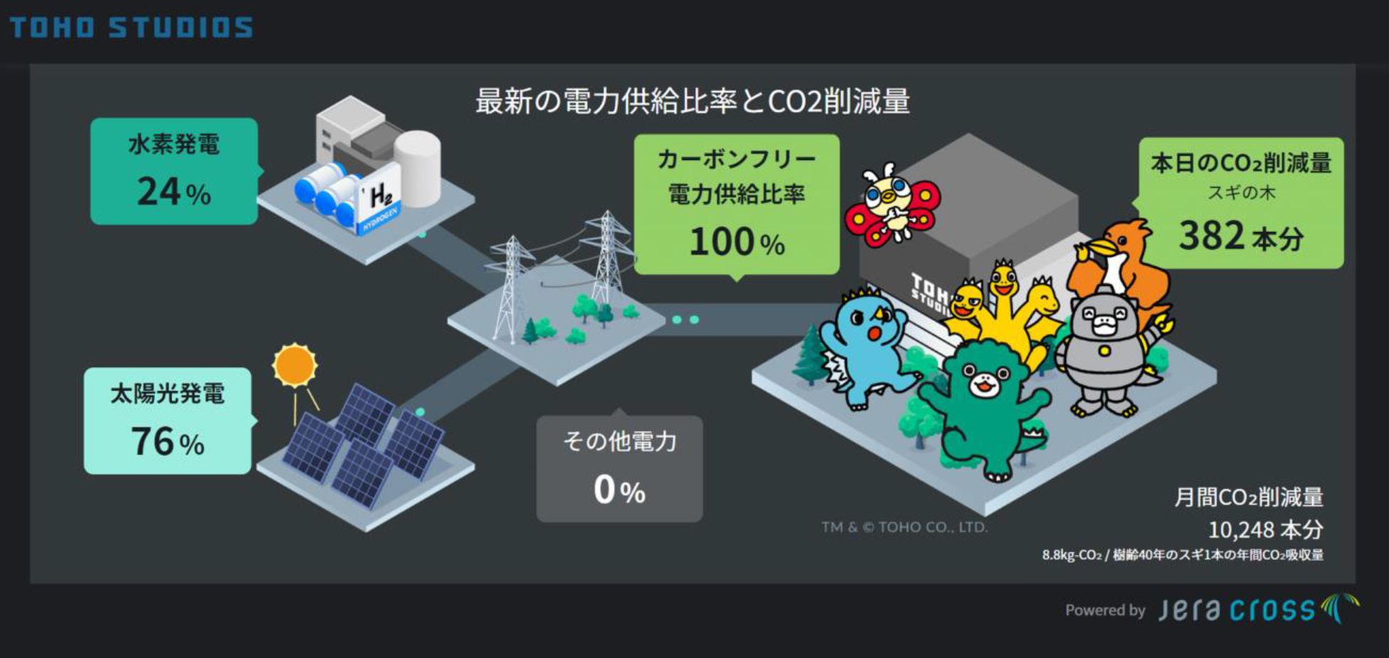 Diagram of electricity supply ratio and CO2 reduction at Toho Studios. Photo courtesy of Toho Co.; Ltd. © TOHO CO., LTD.