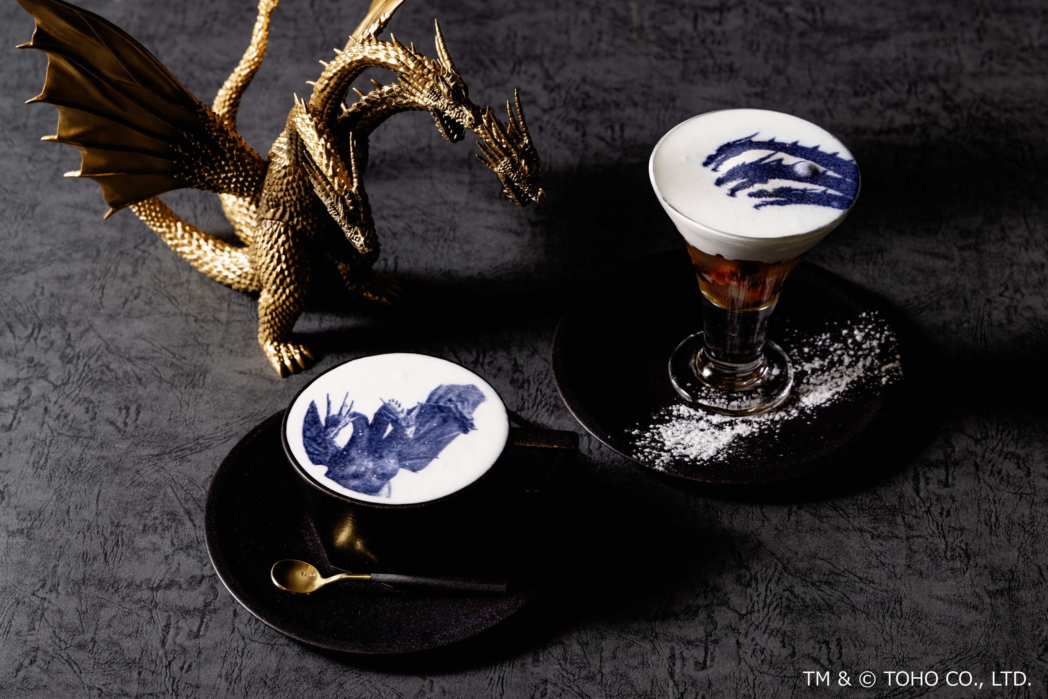 To coincide with the launch of the "Godzilla vs. King Ghidorah Room," which became available for bookings from July 1st, the hotel's 8th floor GRACERY LOUNGE is selling new menu items, such as the "Godzilla Print Art Latte King Ghidorah ver." (ゴジラプリントアートラテ キングギドラver., Gojira Purinto Ato Rate Kingu Gidora ver.) and the "Art Japanese Parfait (King Ghidorah ver.)" (アート和パフェ(キングギドラver.), Ato wa Pafe (Kingu Gidora ver.). The "Art Japanese Parfait (King Ghidorah ver.)" in particular uses Japanese ingredients such as mitsumame, chestnuts, and Yukimi Daifuku, and is topped with King Ghidorah latte print art and gold leaf, allowing you to enjoy the world of Godzilla and Japanese flavors at the same time.