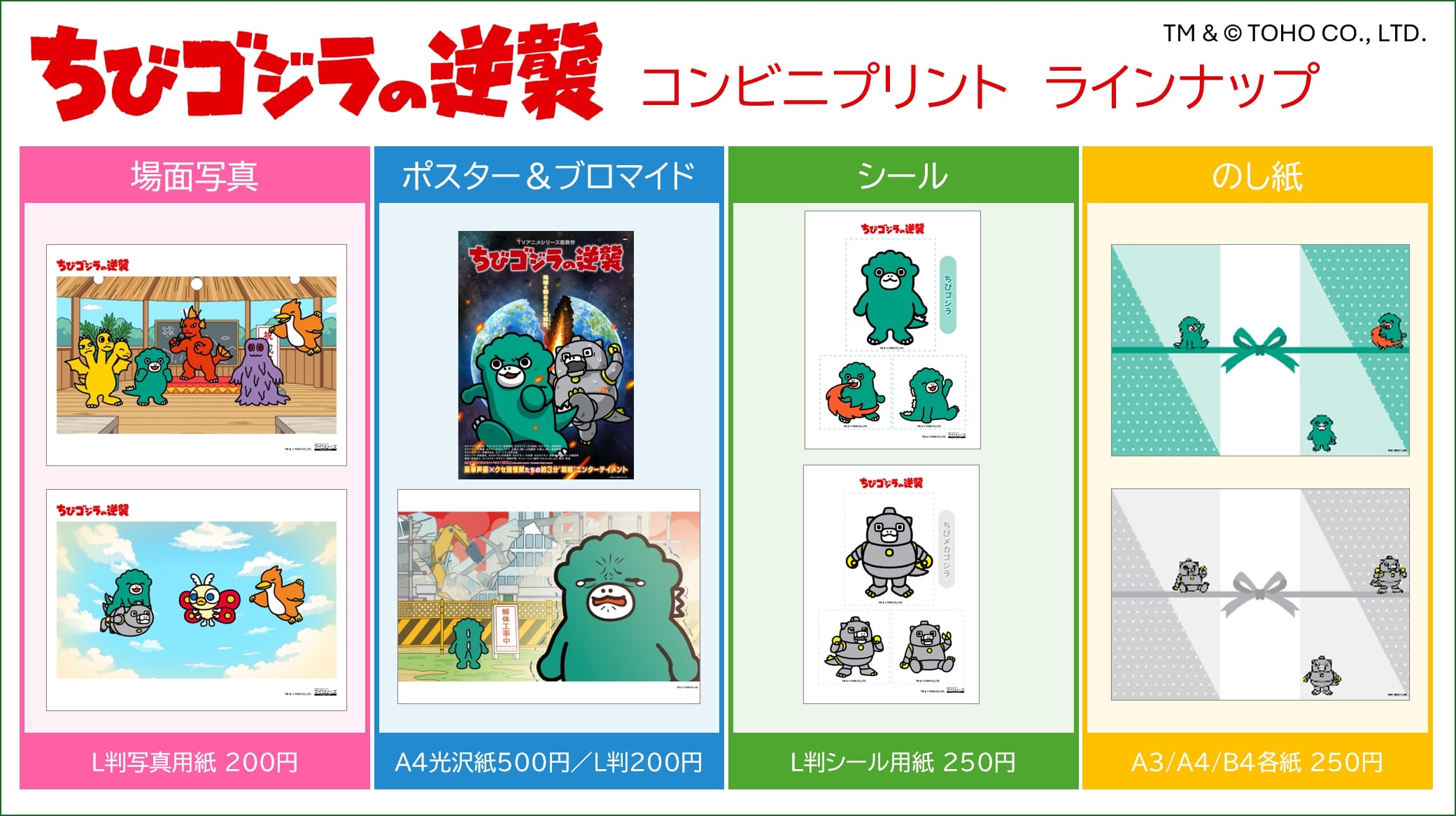 Each month, images from the Godzilla series are available through the “My Series IP Collaborations” (マイシリーズ IPコラボレーションズ, Mai Shirīzu IP Koraborēshonzu) convenience store print service in approximately 30,000 stores nationwide, including FamilyMart, Lawson, Mini Stop, and Poplar stores. The latest set presents images from the popular anime series CHIBI GODZILLA RAIDS AGAIN (ちびゴジラの逆襲, Chibi Gojira no Gyakushū).