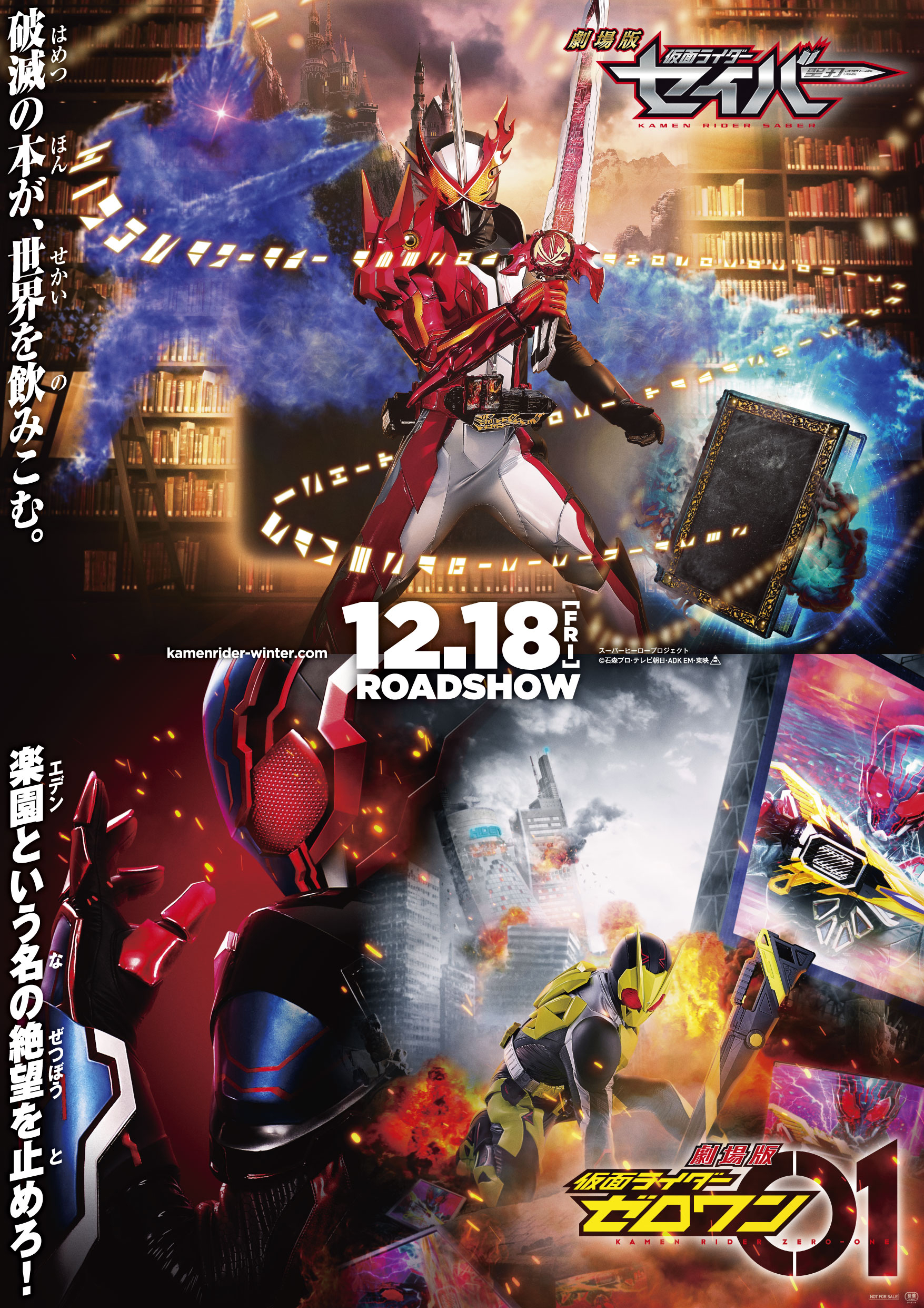 Poster art courtesy of Toei Co., Ltd. â€Kamen Rider Saber ・ Kamen Rider Zero-One†Movie Production Committee ©Ishimori Pro・TV Asahi・ADK EM ・Toei â’¸2020 TV Asahi ・ Toei AG ・ ToeiToei Co., Ltd. has provided SciFi Japan with large, high-res images of the promotional artwork for their upcoming Kamen Rider theatrical double feature. KAMEN RIDER ZERO-ONE THE MOVIE (åŠ‡å ´ç‰ˆ ä»®é¢ãƒ©ã‚¤ãƒ€ãƒ¼ã‚¼ãƒãƒ¯ãƒ³, GekijÅ-ban Kamen RaidÄ Zero Wan) was originally scheduled for July 23rd, paired with MAJIN SENTAI KIRAMAGER THE MOVIE (é”進戦隊ã‚ラメイジャー THE MOVIE, Mashin Sentai KirameijÄ THE MOVIE), but the release was canceled due to the Covid-19 pandemic. ZERO-ONE will now be partnered with KAMEN RIDER SABER THE MOVIE (åŠ‡å ´ç‰ˆ ä»®é¢ãƒ©ã‚¤ãƒ€ãƒ¼ã‚»ã‚¤ãƒãƒ¼, GekijÅ-ban Kamen RaidÄ SeibÄ), the film version of the latest Kamen Rider television series, for a winter movie event. Japanese Release Date: Friday, December 18, 2020 (Roadshow) Production: â€Kamen Rider Saber ・ Kamen Rider Zero-One†Movie Production Committee Distributor: Toei International Sales: Toei ©â€Kamen Rider Saber ・ Kamen Rider Zero-One†Movie Production Committee â’¸2020 Superhero Project â’¸Ishimori Pro ・ TV Asahi ・ ADK EM ・ Toei